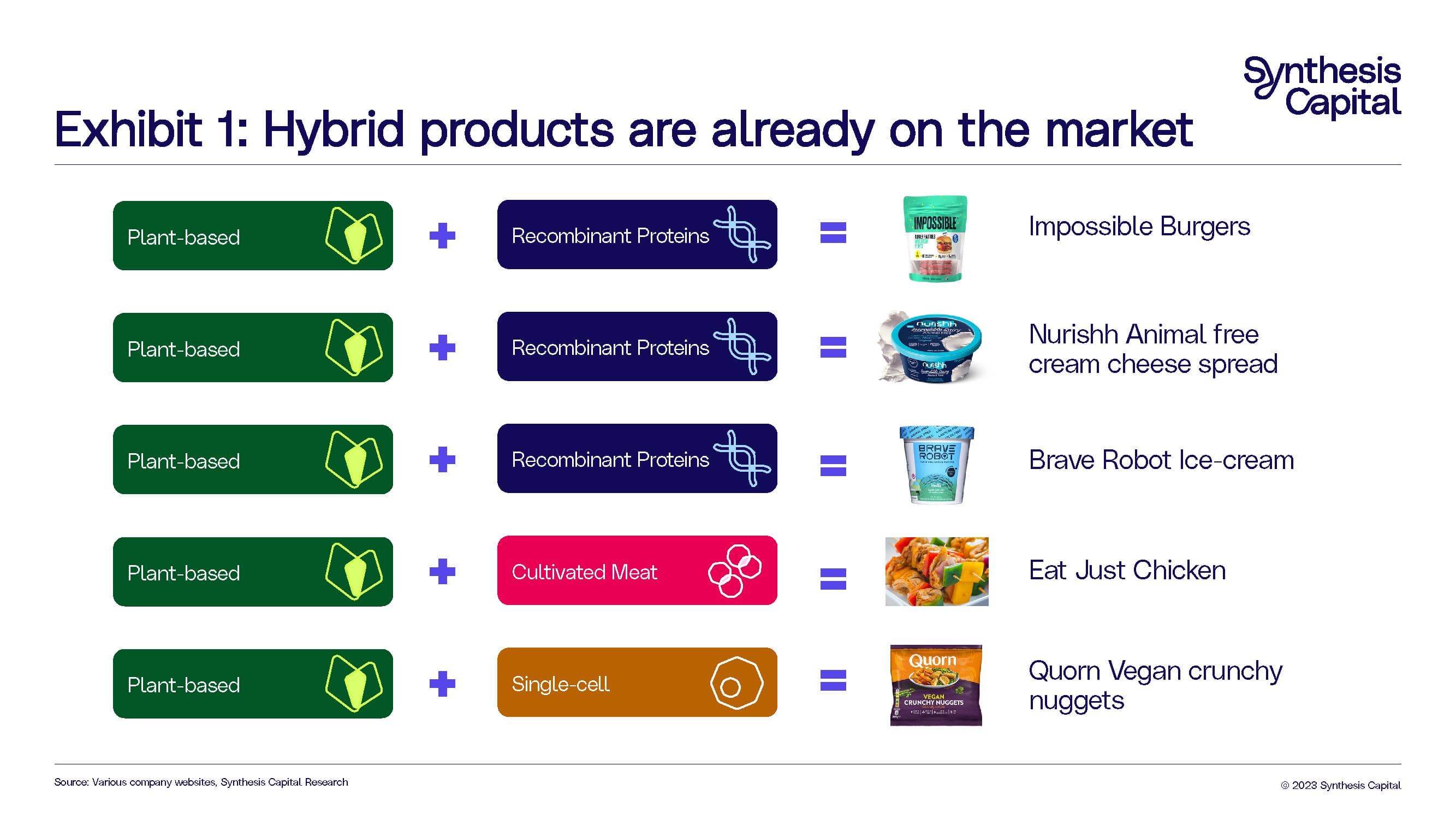 In “What are the Key Milestones for Alternative Protein Adoption to Reach S-Curve Growth?” we outlined why hybrid products are crucial to scaling up alternative protein technologies – they have the benefit of bringing down costs and improving the quality in terms of taste experience. Plant-based and single-cell proteins can make cultivated and recombinant proteins cheaper, and cultivated meat and recombinant proteins can make plant-based and single-cell based products better (Exhibit 3).