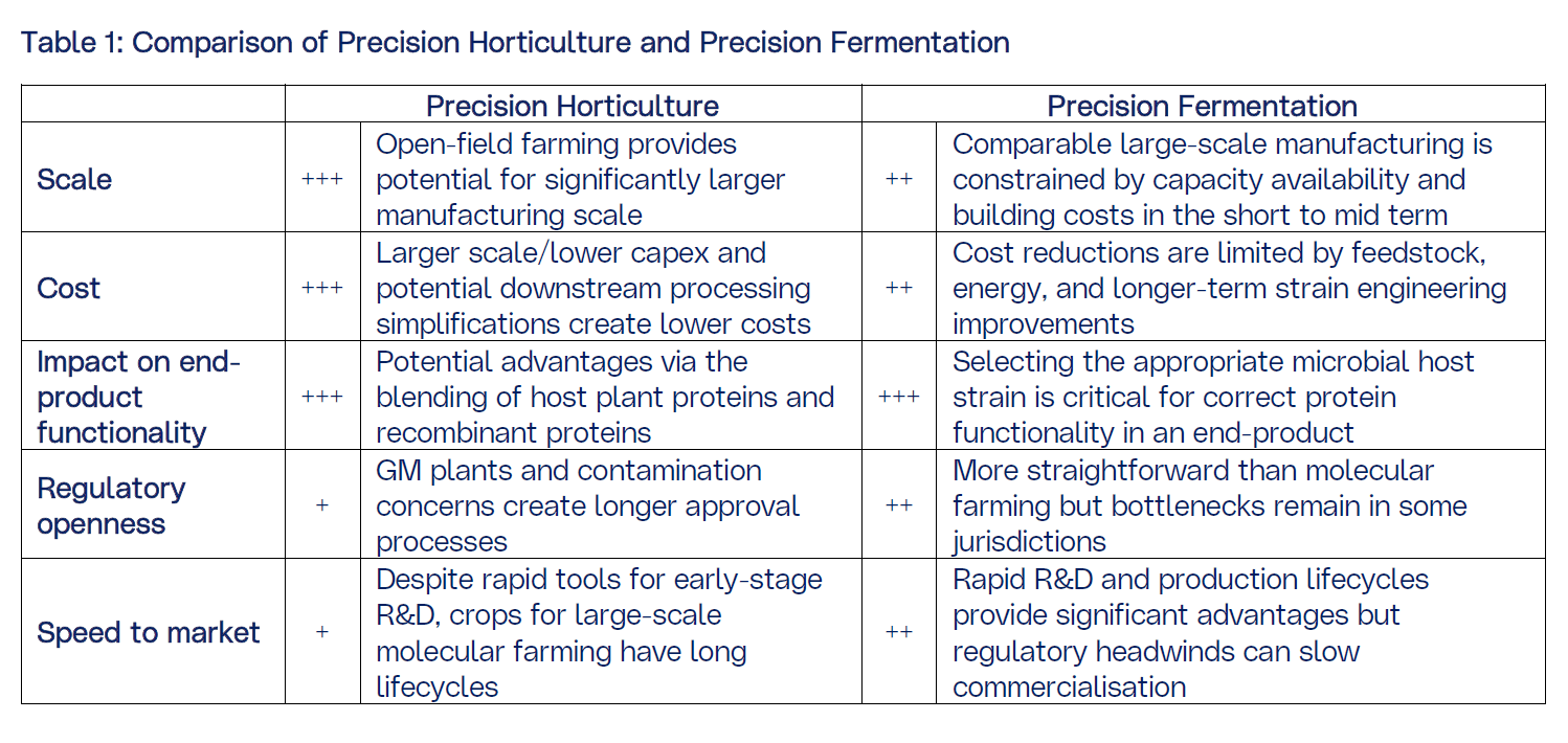 Both platforms have advantages and disadvantages for commercial production of food ingredients. While precision horticulture is gathering momentum, technical and commercial innovations with precision fermentation for food applications are progressing rapidly. As a result, it is unlikely that there will be a single technology platform used to produce all recombinant ingredients in meat, egg, and dairy analogues. Rather the industry will select the most appropriate platform for a given protein based on scalability, cost, impact on end-product functionality, regulatory openness, and speed to market in each target market. (See Table 1).