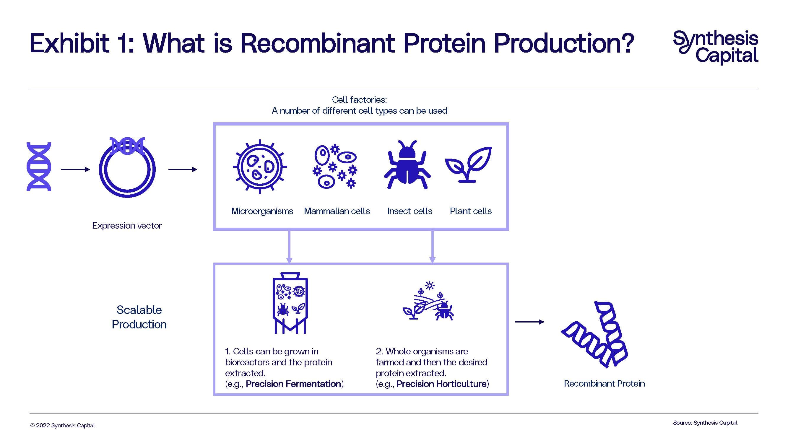 Two platforms have emerged with the most commercial potential for expressing recombinant proteins: 1) precision fermentation, where cells (usually microorganisms such as bacteria or yeast for the purposes of food) are grown in a bioreactor and the proteins are expressed and extracted; and 2) precision horticulture (sometimes called molecular farming or plant-produced proteins), where plant cells are used as the expression system and are grown as crops through indoor or outdoor farming, with the desired proteins ultimately extracted from the plants (See Exhibit 1). Through this article we will use the term precision horticulture for this production method.