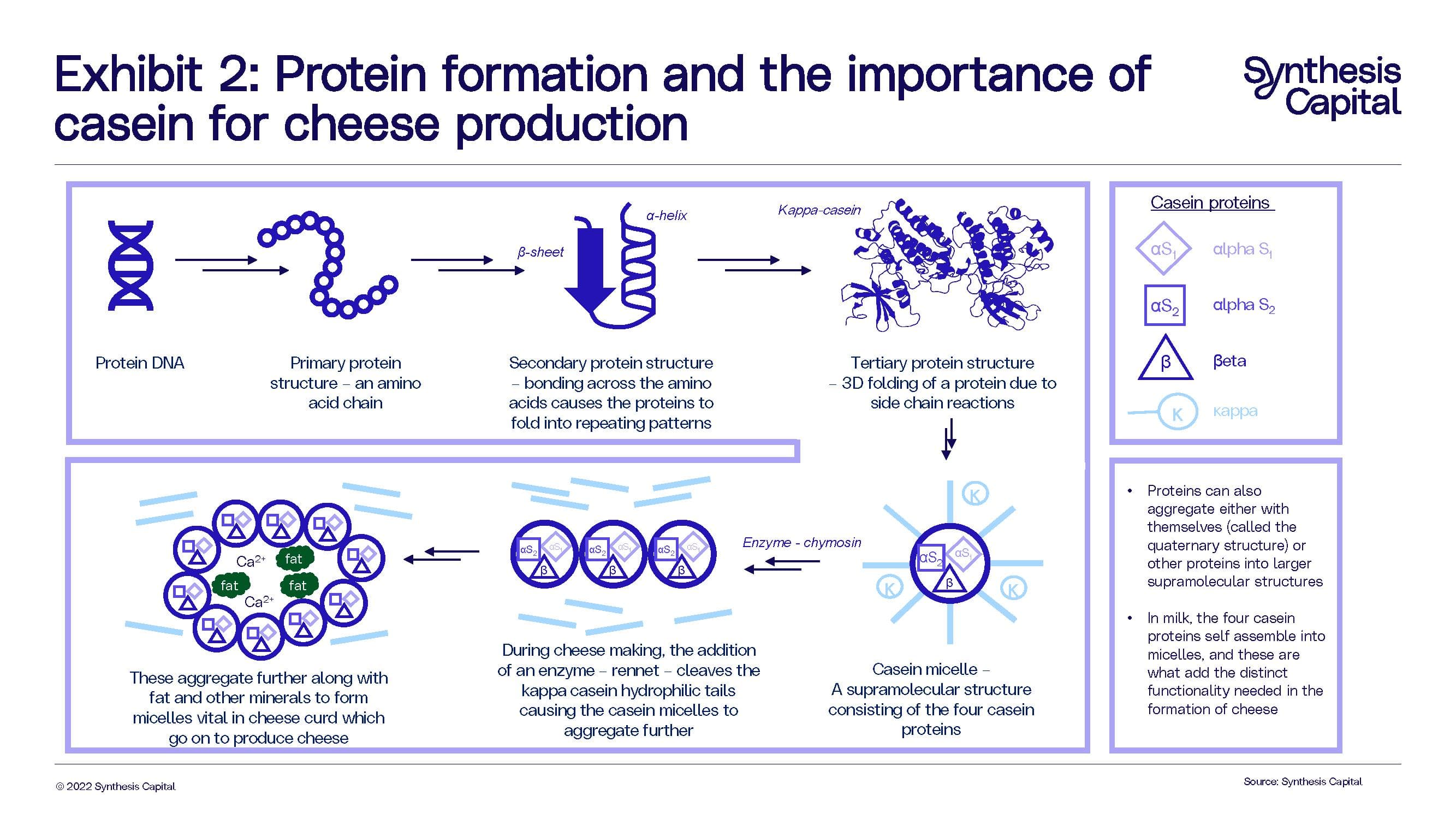 Casein production presents a unique challenge. Casein proteins exist as aggregates in milk called casein micelles (See Exhibit 2). The behaviour of these micelles under different conditions forms the essential component of conventional cheese production, and provides the functional properties that create the stretch, meltability, texture, mouthfeel, and other sensory attributes that consumers associate with great tasting cheese – and which plant-based cheeses have been, so far, unable to recreate. It is challenging to recreate micelles and micelle-fat interactions with plant proteins. This is unlike whey proteins, where production of the main protein β‑lactoglobulin (BLG) provides the functionality needed; in essence the production process can stop at the tertiary protein structure shown in Exhibit 2.