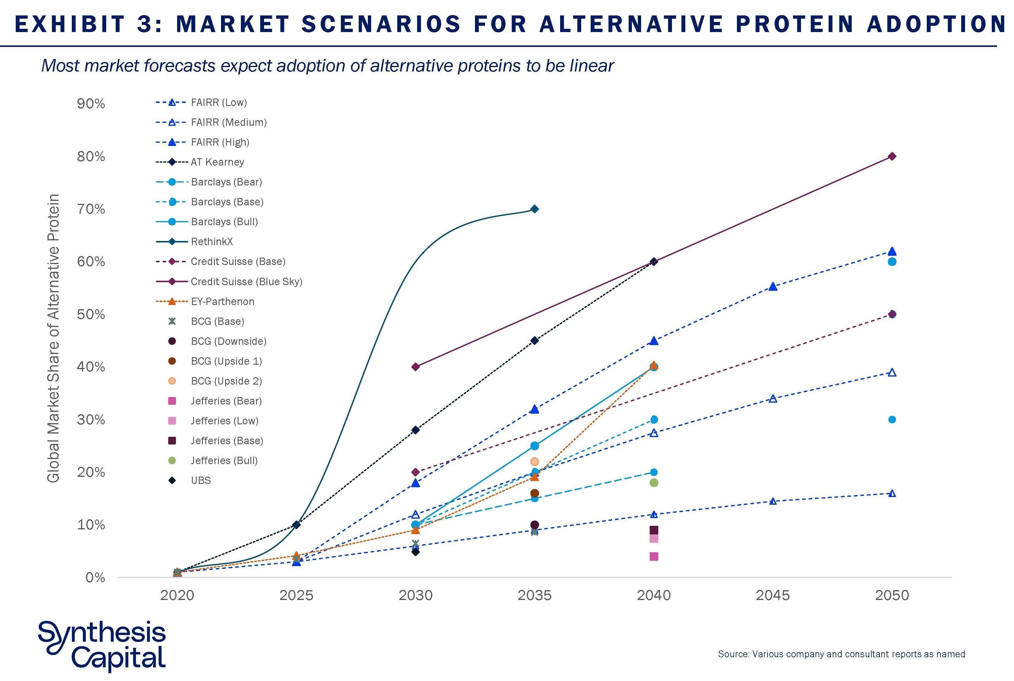 We see a strong tendency towards linear projections in the alternative protein adoption forecasts in the market, barring RethinkX’s 2019 analysis which models S-curve adoption. Indeed, for the most part, the forecasts remain linear even when total projected market adoption is over 10% (Exhibit 3).