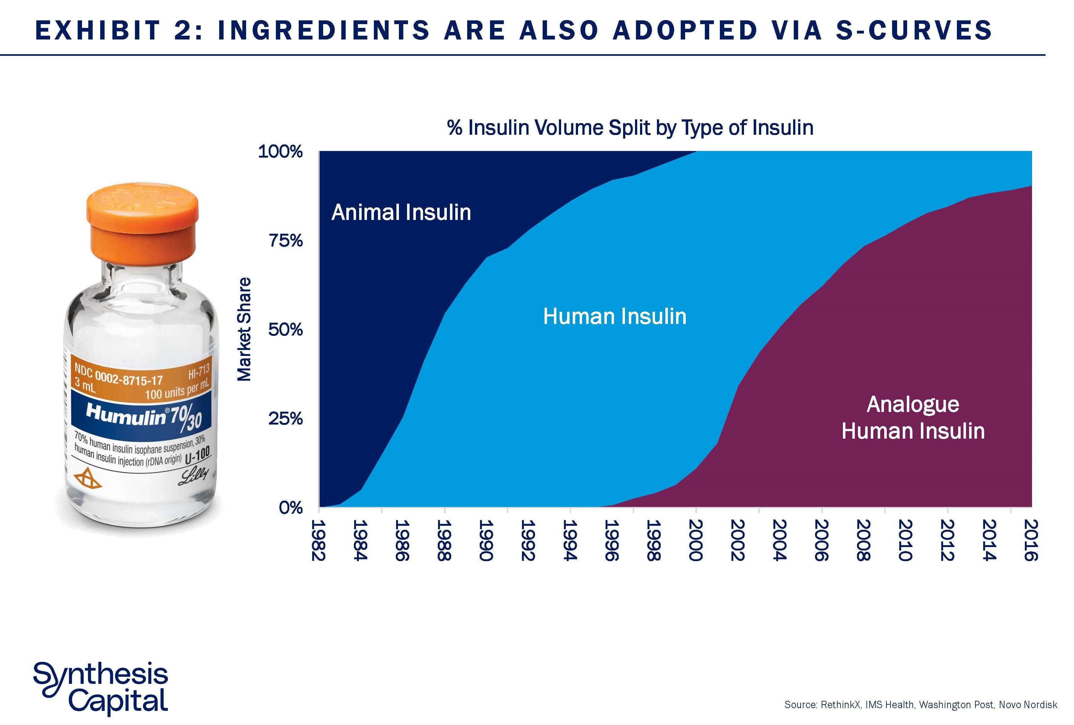 But S-curve adoption is not just limited to information technologies. A range of ingredients and pharmaceuticals have also demonstrated the same adoption profile. Products as diverse as citric acid, rennet and insulin have all been adopted through S-curves.[iv],[v] Indeed insulin has seen two concurrent adoption S-curves, as animal insulin was first disrupted by human insulin and then human insulin disrupted by human analogue insulins (Exhibit 2).