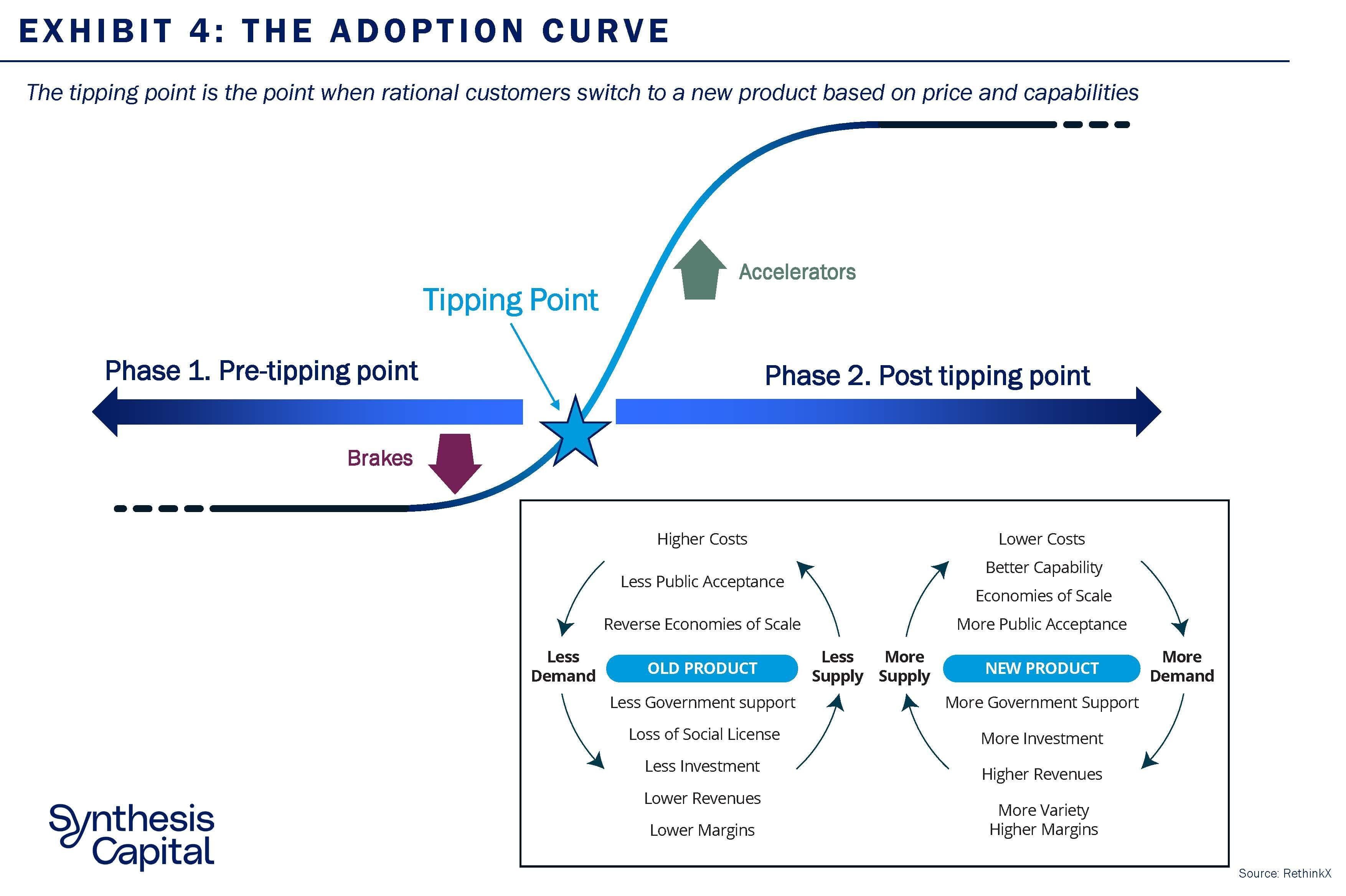 We think about the S-curve in two phases (Exhibit 4). Phase One is the period before the tipping point, and Phase Two is the period after the tipping point, when adoption hits the exponential growth phase. The tipping point itself is defined as the point at which the rational consumer switches to a new product based on cost and capabilities.