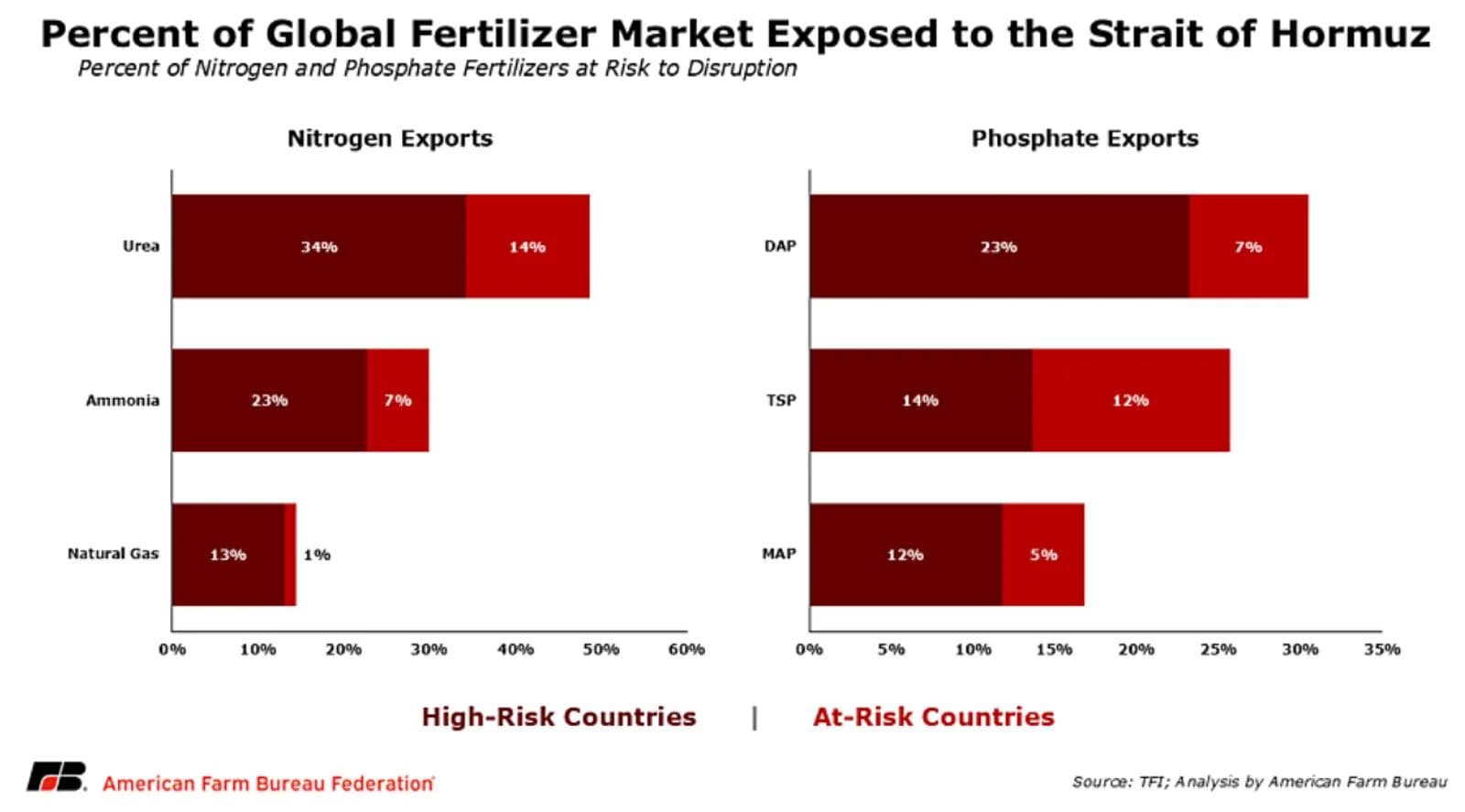 https://www.kpler.com/blog/global-fertiliser-dependency-on-gulf-exports-what-if-hormuz-is-disrupted - American Farm Bureau Federation. Middle East tensions raise spring planting concerns. Market Intel (2026).