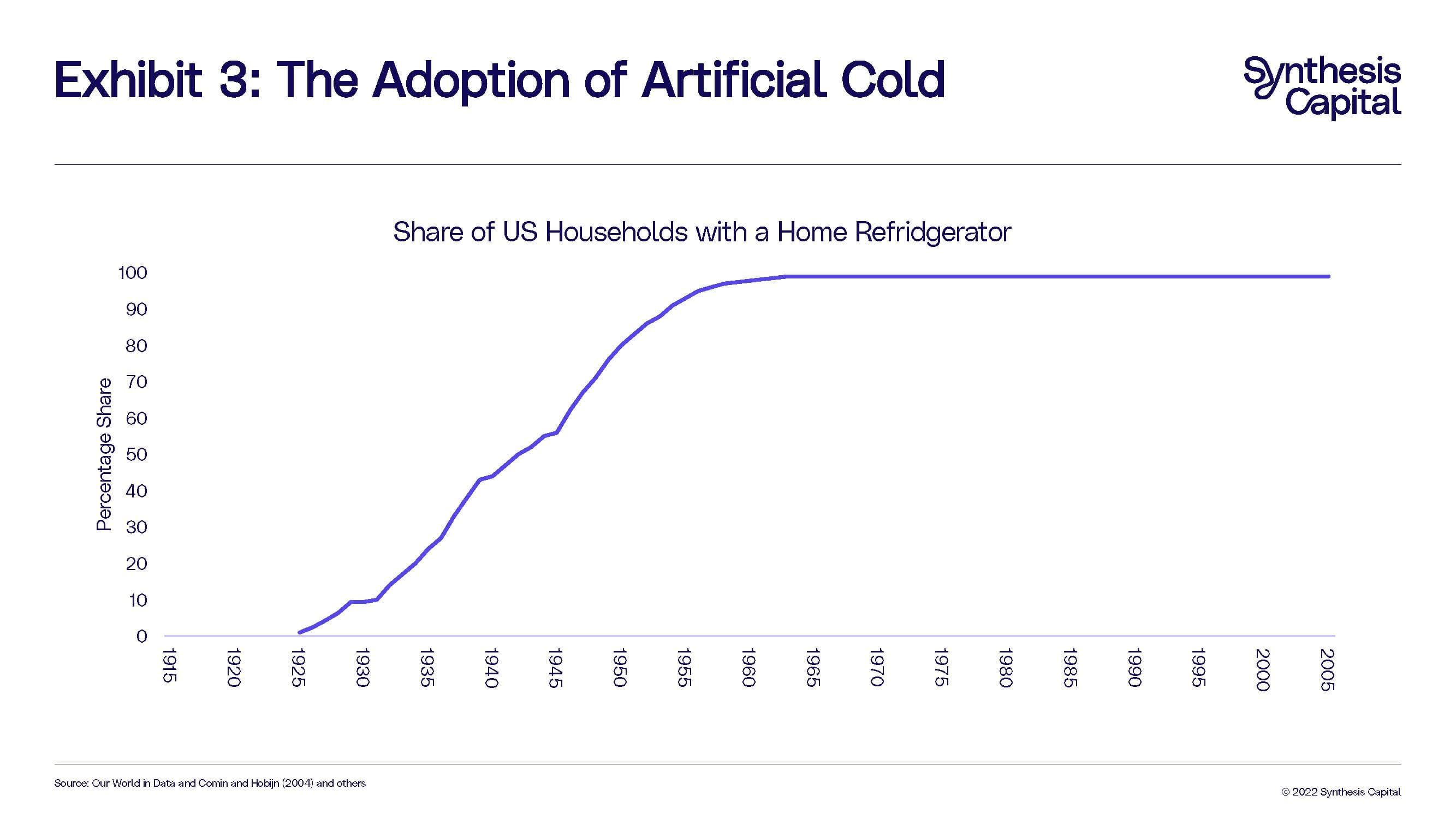 By 1915, the amount of “artificial” ice produced had overtaken that of the “natural” ice industry, but the whole industry was about to change again after the arrival of the first mass produced home electric refrigerator in 1913 – which went on to see S-curve adoption throughout US households and the world (See Exhibit 3).