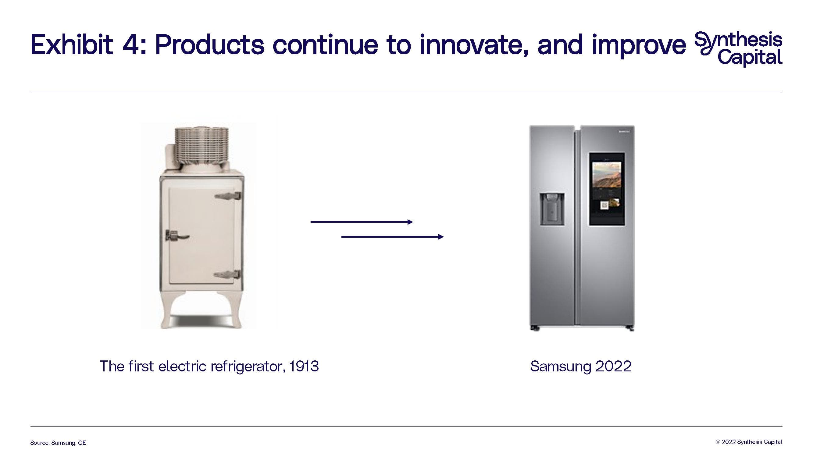 Products continue to get better even past the point of disruption. The electrically powered domestic refrigerator came after the natural ice trade was disrupted, and home refrigerators today look very different to those first ones – and are continuing to change! (See Exhibit 4).