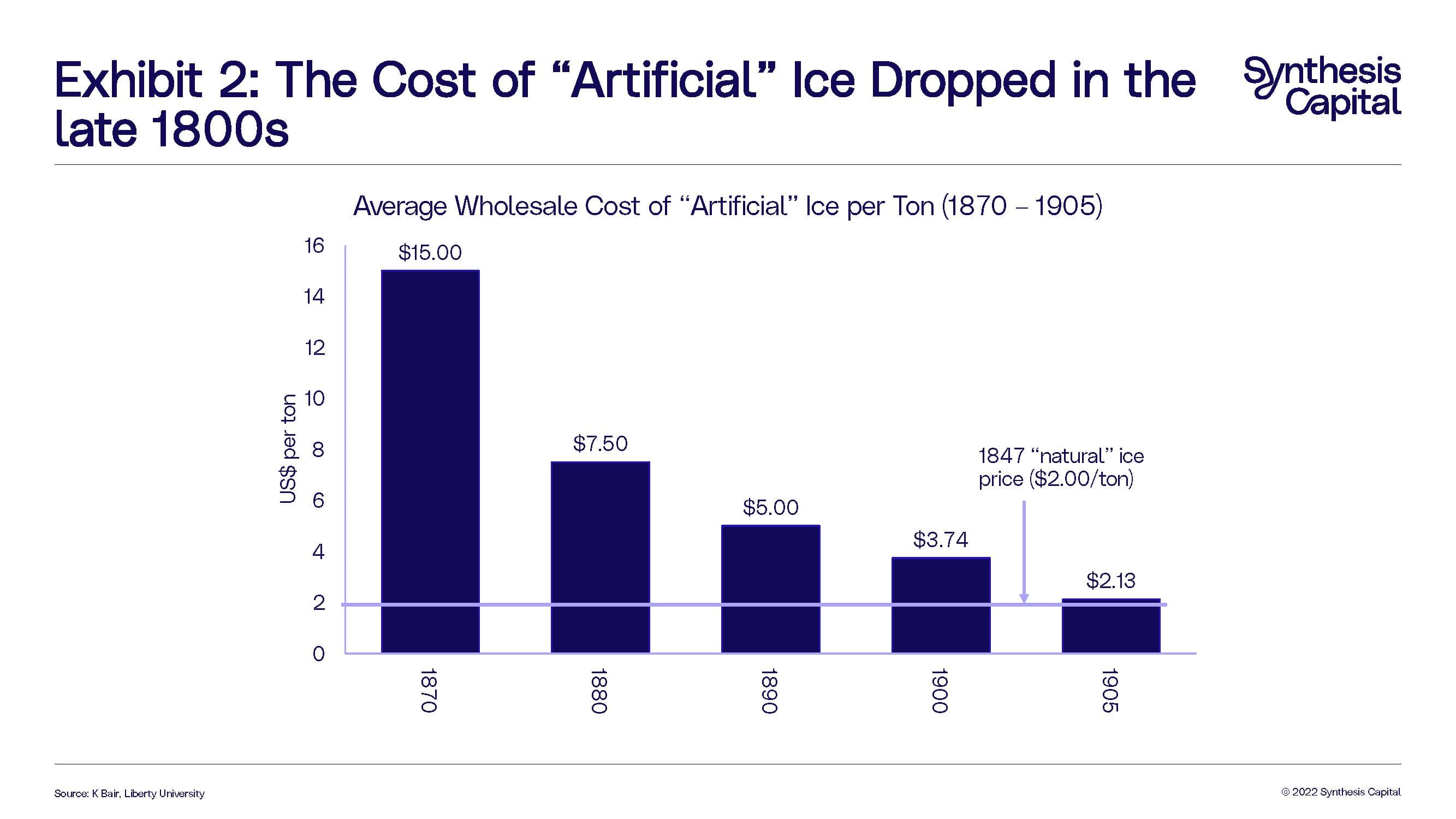 The expansion of “artificial” ice production – along with the process improvements that came along with that – also mean the cost of its production was also falling, and by 1905 was similar to the cost of natural ice production in 1847 – which marked a time it was plentiful and cheap. (Exhibit 2)